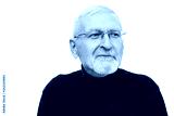 Portrait of old handsome man with gray hair and beard in eyeglasses and black sweater happily looking aside over white background isolated
