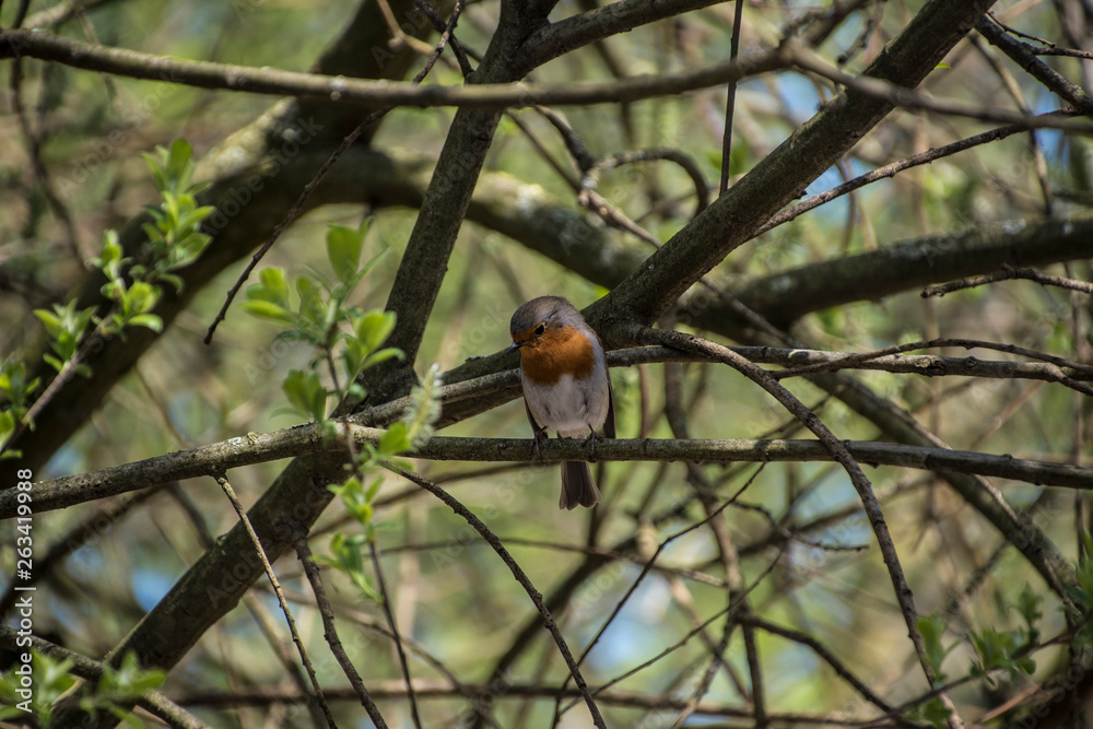 Red Robin (Erithacus rubecula) bird close up in a forest