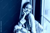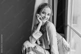 Portrait of smiling, happy blonde girl next to the window, relaxing in the morning, having good time at home. She's dressed in nice silk pijamas.