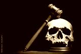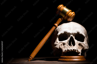 Legal law, justice and murderment concept. Wooden judge gavel hammer on human skull against black background. Free space.