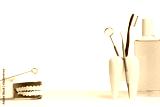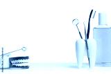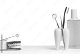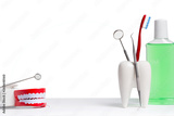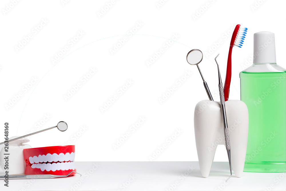 Dental health and teethcare concept. Dental mirror with explorer probe and toothbrush in white tooth model near mouthwash. Human jaw model with dental floss against white isolated background