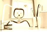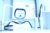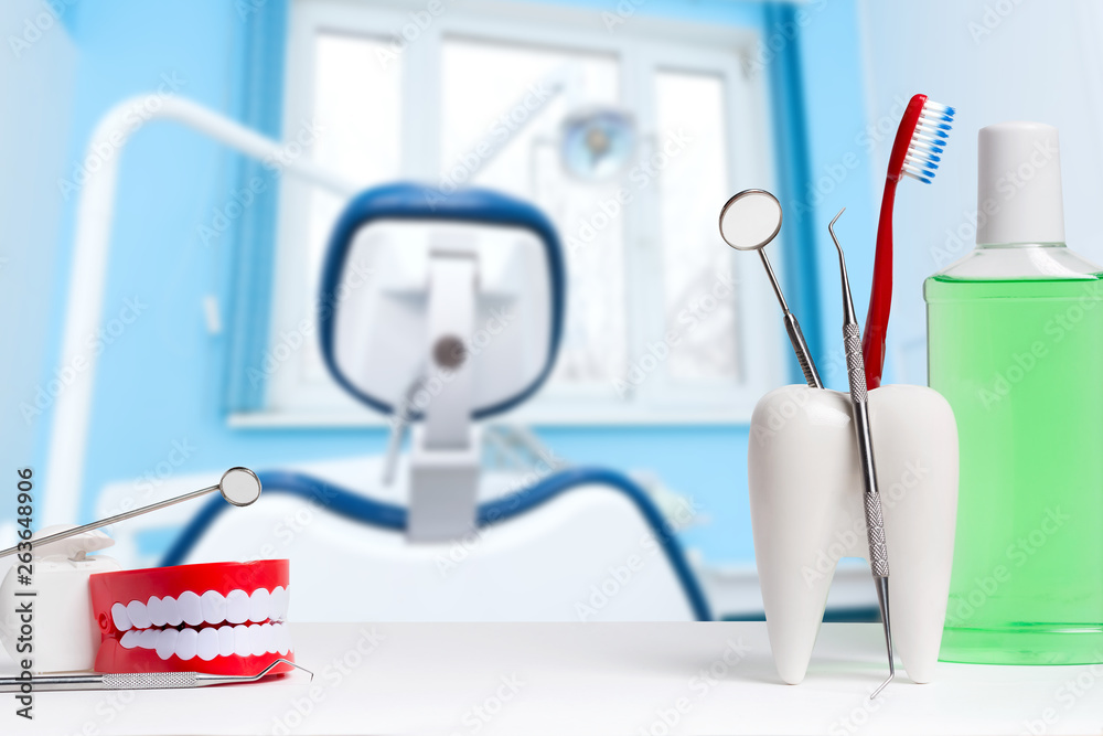 Dental health and teethcare concept. Dental mirror with explorer probe and toothbrush in white tooth model near mouthwash. Human jaw model with dental floss against dental office and chair background