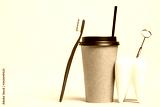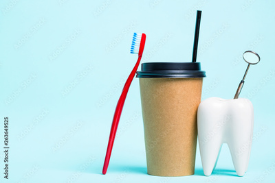 Oral dental hygiene. Healthy white tooth and dentist mirror near toothbrush and plastic thermo cup of coffee on light blue background