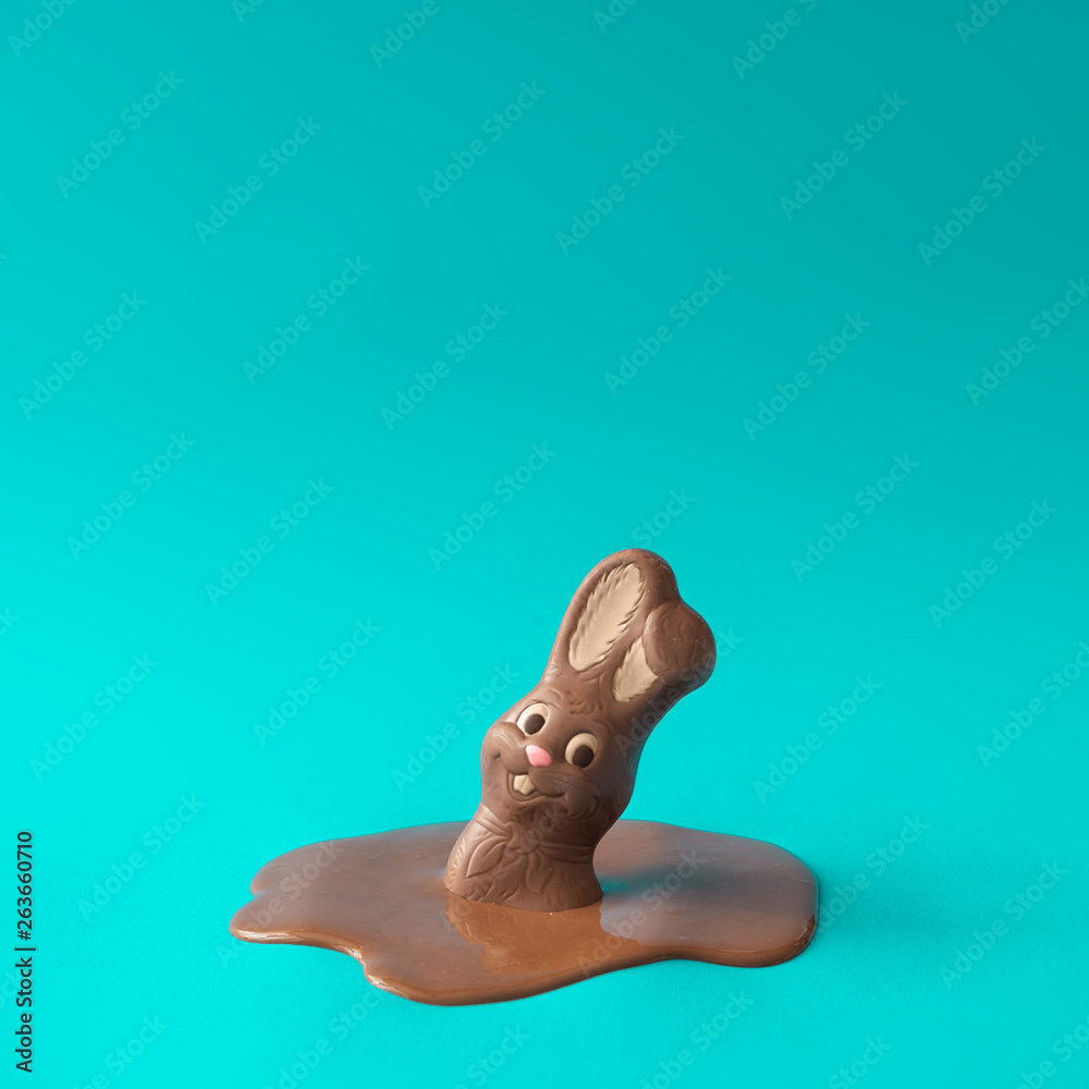 Easter chocolate bunny rabbit melting. Creative Easter holiday concept background. Minimal style.