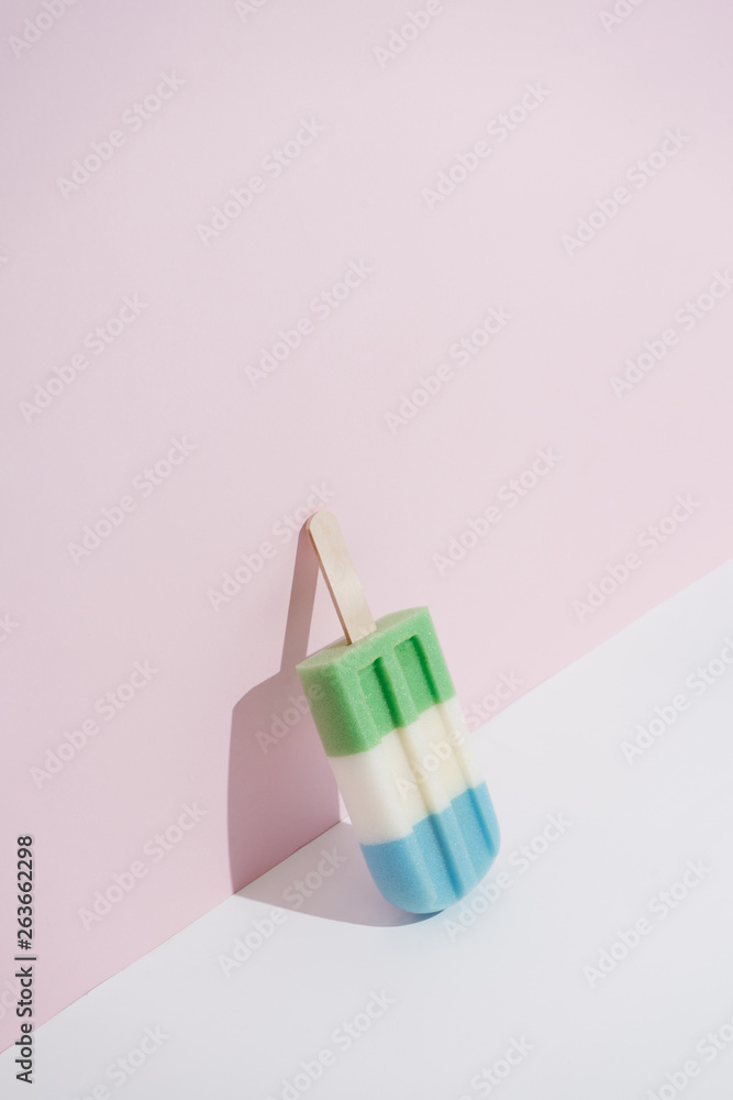 Colorful Ice cream popsicle on pastel pink background. Minimal summer composition.