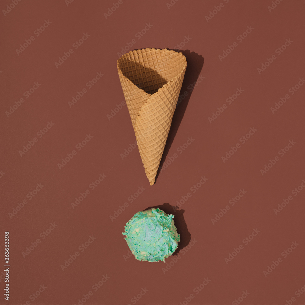 Ice cream cone with scoop of ice cream on brown background. Minimal summer food concept. Flat lay.