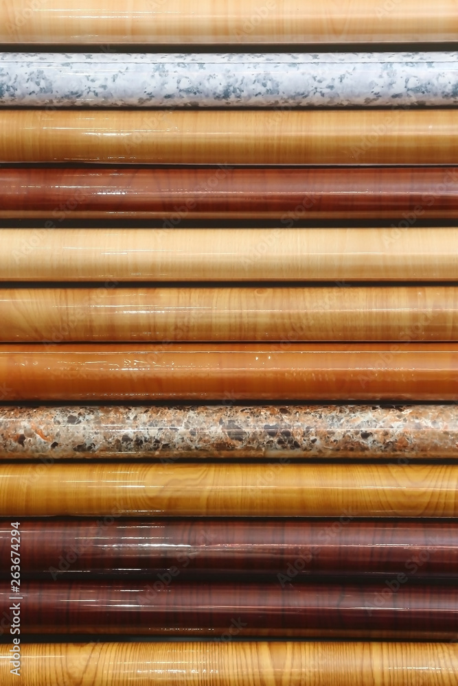 Material for decor. Self-adhesive film with different designs in rolls on the shop window for sale