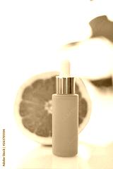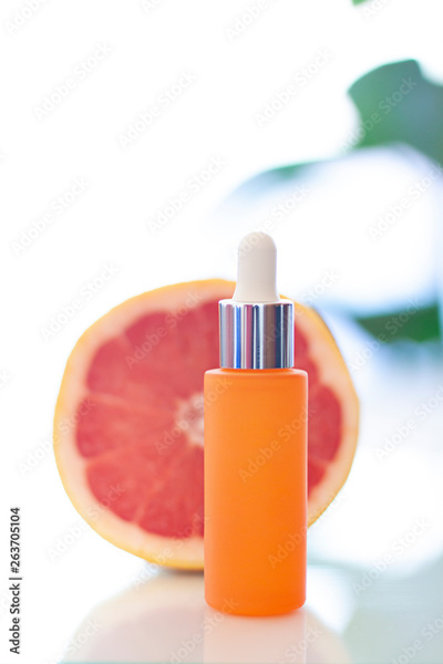 Vitamin C serum in the orange glass cosmetic bottle close up with a grapefruit in the bathroom