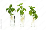 The fresh green sprouted basil with roots isolated on white background. The plants are in the glasses with water.