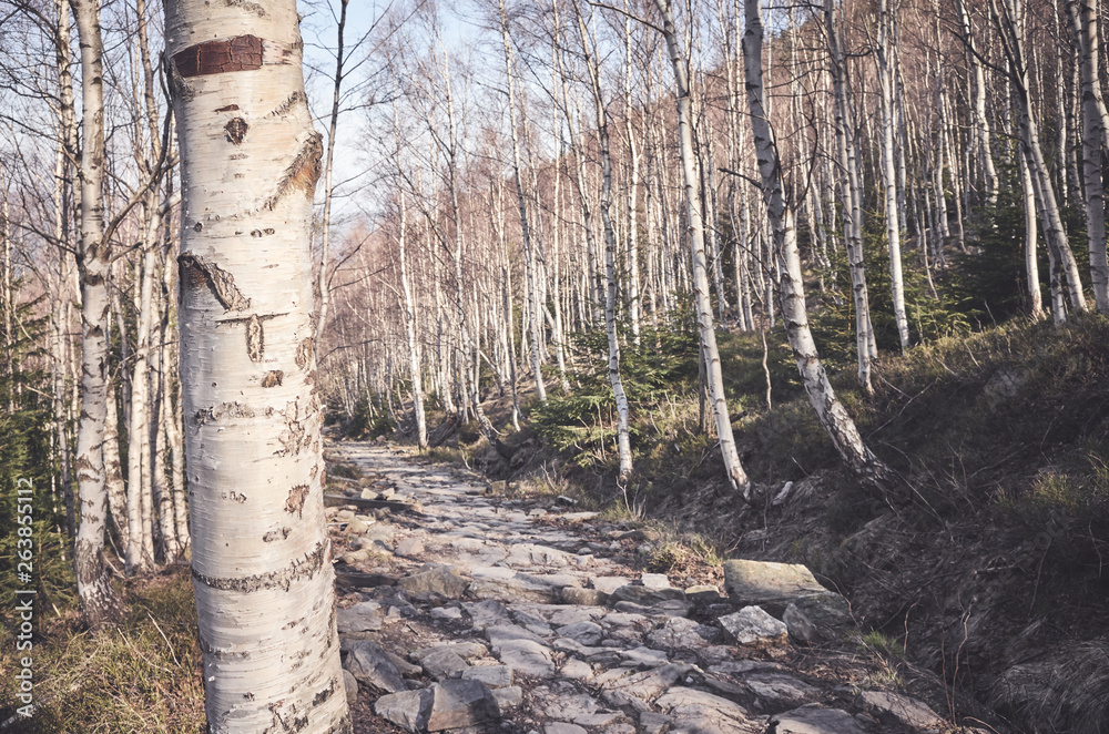 Close up picture of a birch tree in a mountain forest, selective focus, color toning applied, Karkonosze National Park, Poland.