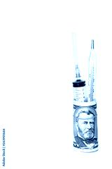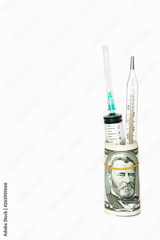 medical syringe and thermometer in a roll of dollars on a white background