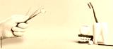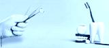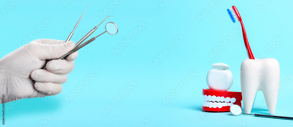Dental health and teethcare concept. Dental mirror, human jaw model and dental floss near white tooth model with toothbrush. Instruments in doctors hand with rubber glove on light blue background.