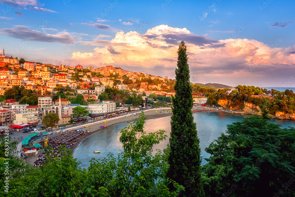 Panoramic view of Ulcinj at sunset, beautiful mediterranean town, popular summer tourist resort in Montenegro, scenic travel background with urban architecture, sand beach and dramatic cloudy sky