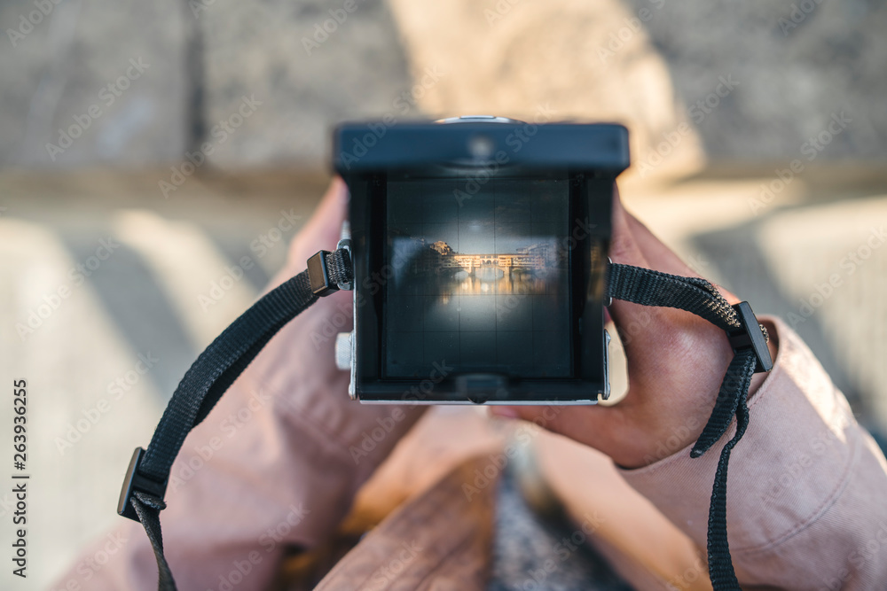Detail of Ponte Vecchio in Florence. Point of view of a young woman while taking a photo with an old analog camera. Old bridge symbol of the city