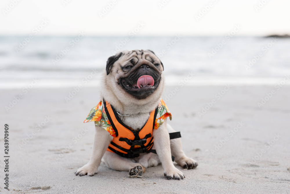 Happy dog pug breed wearing life jacket and sitting on beach feeling so happiness and fun vacations on the beach,Dog vacations Concept