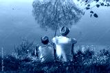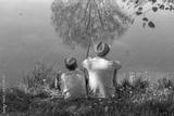 Back view of happy family on summer vacations concept. Father and son fishing together at river bank at scenic landscape background of fresh green grass and blue calm water.