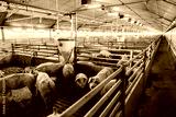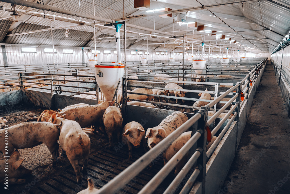 Lots of pigs in animal shed eating, standing and lying. Meat industry concept.