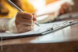 Close up hand of woman holding pencil thinking and writing data or business planning in paper for remember and learn,Writing Education Concept