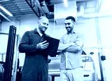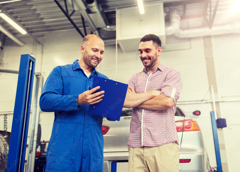 auto service, repair, maintenance and people concept - mechanic with clipboard talking to man or owner at car shop
