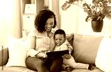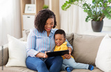 family, motherhood and technology concept - happy african american mother using tablet computer with little baby son at home