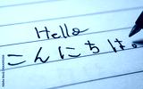 Beginner Japanese language learner writing Hello word in Japanese hiragana characters on a notebook
