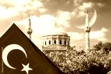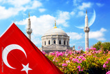 Pink flowers with Pertevniyal Valide Sultan Mosque, an Ottoman imperial mosque in Istanbul, Turkey with a turkish flag and crescent moon. Islam, moslem and Ramadan concept.