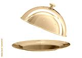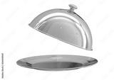 open chrome silver cloche on food plate in restaurant isolated on white background