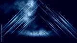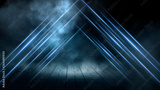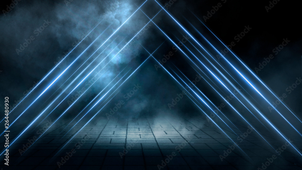 Dark empty scene, blue neon searchlight light, wet asphalt, smoke, night view, rays.