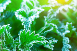 Frosted green leaves in the morning with sunlight. Beautiful frost on green leaves in garden. Nature background. Cold and calm concept. Frozen weather. Fresh environment. Frosted leaf edge texture.