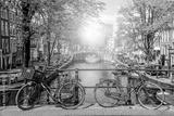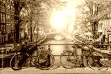 Old bicycle on the bridge in Amsterdam, Netherlands against a canal during summer sunny day. Amsterdam postcard iconic view. Tourism concept.