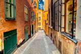 The narrow cobblestone street with medieval houses of Gamla Stan historic old center of Stockholm at summer sunny day.
