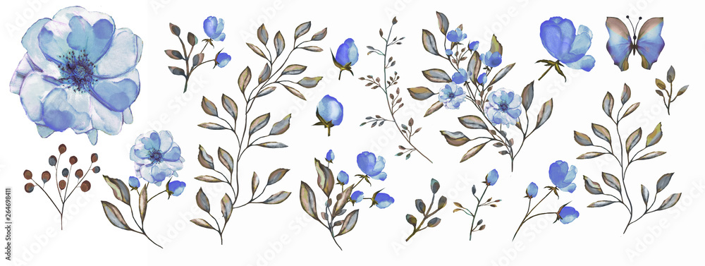 Watercolor illustration. Botanical collection. Set: leaves, flowers,branches, herbs and other natural elements. Blue flowers.