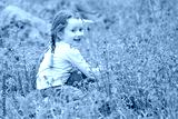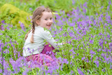 Young girl happy laughing picking bluebell flowers outside in spring summer forest woodland