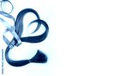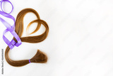 long blond hair donation put like heart with lavender ribbon as symbol of fight against cancer on white background. Top view. Natural material for making wig for patients. Horizontal isolated. Concept
