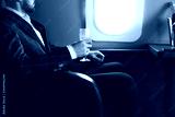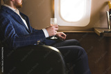 A young successful businessman in an expensive suit sits in the chair of a private jet with a glass of champagne in his hand and looks out the window
