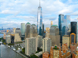 Stunning aerial view of Manhattan Skyline, with World Trade Center, New York, USA. Panoramic skyline with skyscrapers and financial district and Hudson river, New York, USA
