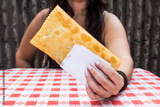 Young woman holding brazilian snack known as Pastel - asian recipe.