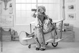 Little boy in the image of a tourist looks through binoculars near a toy-plane