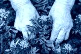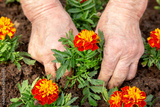 Hands of elderly man planting a flower into the soil of a flowerbed. Ecology spring background concept.