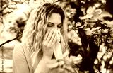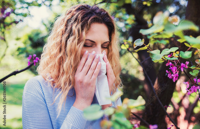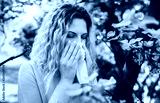 Cold and flu. Woman blowing her nose with a tissue