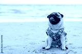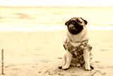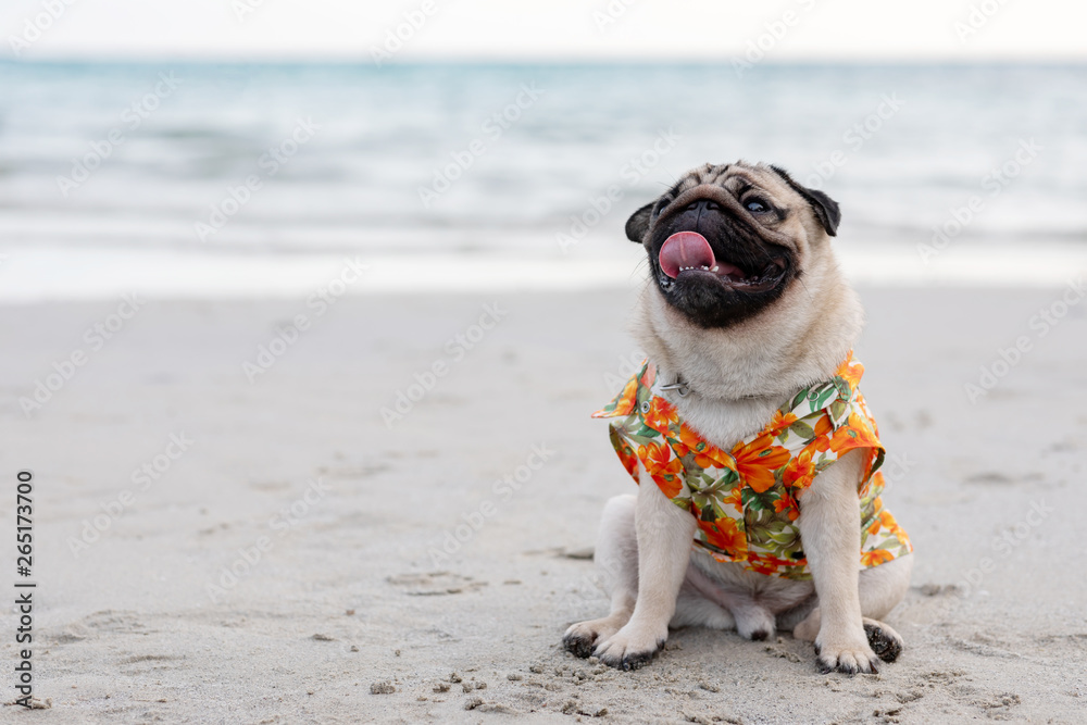 Happy dog pug breed wearing Aloha shirts sitting on beach feeling so happiness and fun vacations on the beach,Dog vacations Concept