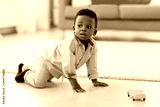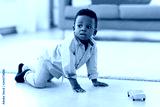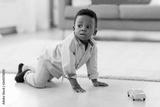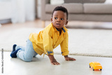 childhood, kids and people concept - lovely african american baby boy playing with yellow toy car on floor at home