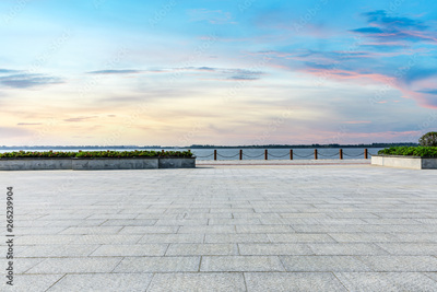 Beautiful lake and walkway with sky clouds at sunset