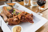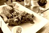 Meat platter with roasted meat, sausages, mustard seeds sauce and glass of red wine