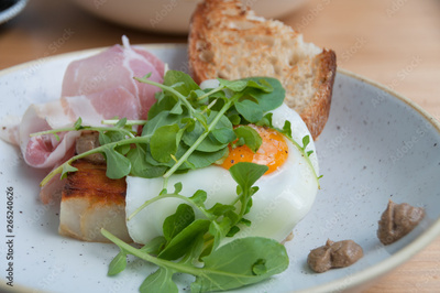 Breakfast of egg with runny yolk on sourdough toast with bacon, pancetta
