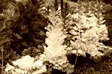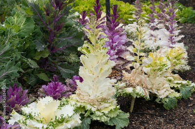 Bright ornamental lettuce plants with colorful leaves on flower bed