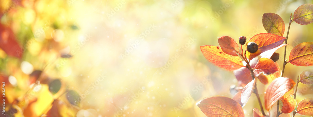 Beautiful colorful autumn natural background . Orange red autumn foliage on blurred gold background glows in sunlight outdoors in nature. Template, copy space, wide format.