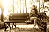 Young and attractive girl sitting on a bench in autumn park and drinking coffee