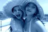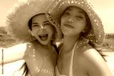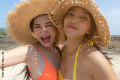 Beautiful young women have summer holiday or vacation time at beautiful beach. Pretty girls get enjoying their summer season life together. Asian women get happiness and fun. They wear bikini, hats.