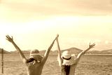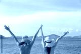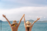 Beautiful young women holding hands, raise up hands together. They are friend and always love traveling together when they get holiday or vacation time in summer season. sea sky mountain background